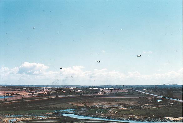 Chinook choppers taking guys from the field into USARV to see the Bob Hope Christmas Show. That's Tanker Valley in the distance, and the road to Vung Tau.