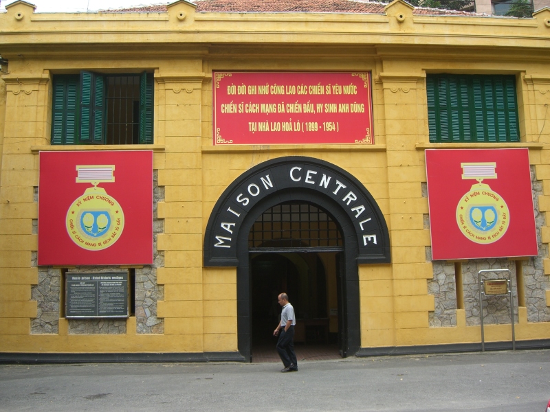 The Ha Long Prison, in downtown Hanoi near the former French Quarter, gained infamy as the "Hanoi Hilton", sarcastically so-named by the American pilots who had been shot down over North Vietnam and were incarcerated and tortured there during the Vietnam War (aka "The American War" in Vietnam) in the late 1960s and early 1970s. It was originally built by the French over a period of years stretching from 1886 to 1901 and was used by them to jail and torture Vietnamese dissidents, political prisoners who were agitating for independence for their country. In true colonialist fashion, the French were having nothing to do with such crazy talk, and ended up imprisoning in subhuman conditions as many as 2000 prisoners at one time. I was surprised at how small it was, with a land area not much larger than the typical suburban lot. But then I learned that the prison today covers only about a third of its original footprint, the majority of the "missing" pieces having been torn down in the early 1990s to make room for a modern high-rise office building. In particular, the wing of the prison that once housed American POWs is gone. Click on the thumbnail to the left to see a picture of the prison in 1970, taken by US Air Force reconnaissance. The red outline contains approximately the size and dimensions of the prison today. The area inside the walls, filled with trees, that is closest to the camera is now the site of the high-rise, and the yellow arrow points to the entrance on the far side. Inside the prison are some displays of US POW artifacts, including John McCain's flight suit and parachute, and a series of propaganda photos showing happy and smiling Americans. But I guess, since they won the war, they can pretty much write their own history of it Several other rooms had life-size clay models of prisoners chained together and lying on a long series of wooden slatted platforms. All of these models are, of course, Vietnamese in appearance and are intended to show the abhorrent treatment they received from their French overlords. The original guillotine is still there, and the once-sharp blade edge looks suspiciously as though it still had some dried blood on it. I can't imagine that would still be the case, some 70 years after it was last used, though, so they must to a little "doctoring" periodically to keep the dried blood looking fresh. |