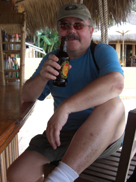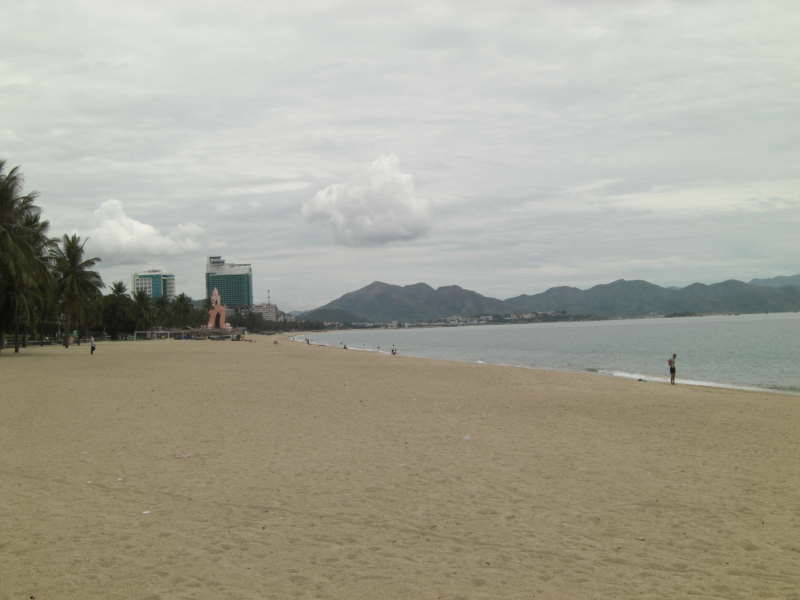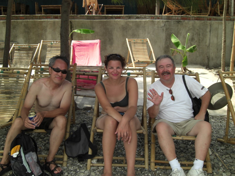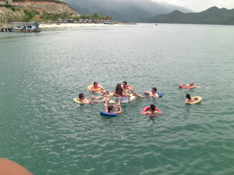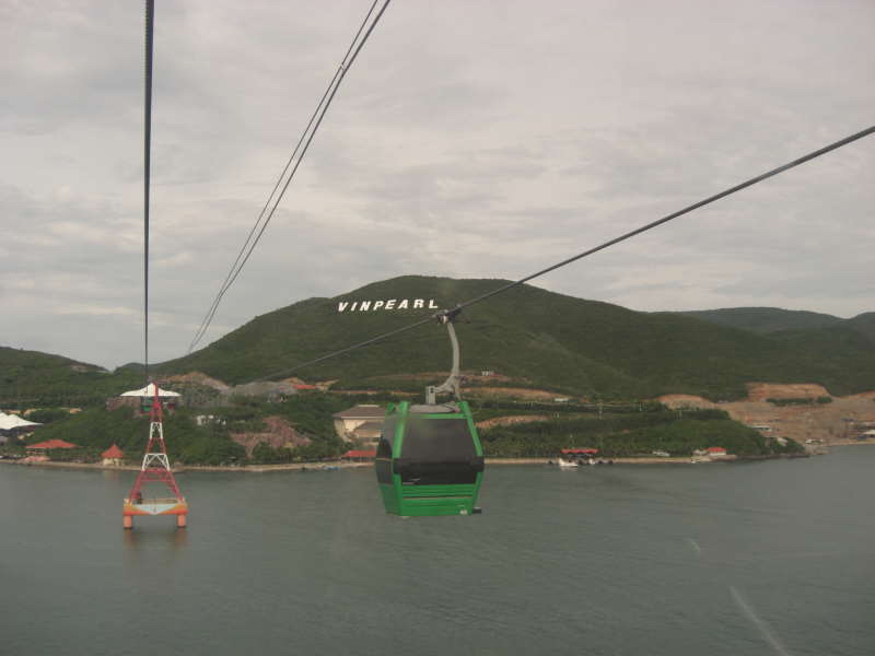 On the morning of the 17th of September we boarded our train from Hue to Nha Trang. Since the train passed along the most spectacular part of the Vietnam coastline, we took a day train instead of an overnight train. Despite a kind of unsettling incident (see On the Trains for details), we managed to relax for the most part and watch the coastline roll by, until later in the evening, well after dark, we rolled into Nha Trang. Nha Trang is a premier beach resort city, with an extremely long white sand beach, terrific snorkeling and scuba diving (or so I'm told; I didn't get –-- didn't take -– the chance to do either while we were there). Because it was late, our hotel didn't have anything for us to eat, and it turned out that there were no restaurants within easy walking distance that were open, so we ended up taking a taxi to an outdoor seafood café populated almost 100% by locals. As is usually the case wherever I go that's at all off the beaten track, they were really ... interested in what I was doing there. But I always go abroad armed with a friendly smile and an outgoing attitude, and that has served me well wherever I've gone in the world. As I say, it was a seafood restaurant, but what I hadn't realized walking in was that the tanks and tubs of water on both sides of me held tonight's dinner. I was expected to walk back out, find a victim and tell them "off with his head"… I started calling it Death Row and, big pussy that I am, couldn't actually get to the point where I was the one fingering the fish for death, dismemberment and digestion. So yeah, I'm a big hypocrite. I have no problem eating dead things; I just don't want to be the one doing the killing, either directly or semi-directly; indirectly, though, that seems to be okay. I ended up telling them to "surprise me" with one of their house specialties. And surprise me they did. The brought me an order of shrimp. Okay, in the US when you order shrimp, you usually get a platter of breaded shrimp tails, and the only shell part left on it is down at the very end, which you can use as a handle to dip the shrimp in the sauce. And I don't even order "peel-n-eat" shrimp in America because the hassle of peeling the little bastards far exceeds the satisfaction in eating them. However, in Vietnam when you order shrimp, you get this: Whole shrimp. Whole large shrimp, which means all of the shrimp: Head and brains and guts and intestines and shit and the whole works come slabbed onto your plate, all still neatly wrapped in that pink crustacean carapace, their little tiny feet dangling off the underside. Jeez. But when in Rome, etc., so I managed to choke down a portion of it, until Minh noticed what was going on, laughed a little bit at me, and offered to take the remainder of the shrimp off my hands. So I handed him the plate, but I still had shrimp juice, guts, brains, etc., on my hands, and would have for several more days until the smell finally wore off. As much as I love seafood, I decided that I would forego the Vietnamese shrimp for the rest of the vacation. But I made up for it by eating tons of squid, clams, mussels, etc., the rest of the trip. Nha Trang is a beautiful seaside resort city, and an indication that Vietnam is finally catching up with the rest of the world is the fact that the 2008 Miss Universe contest was held there in July. We missed it by only a couple of months. Of course we also missed "high season" for tourists. Apparently September is the perfect month to go to Vietnam's tourist destinations if you want to avoid the crowds. At Nha Trang they were nonexistent, and when we went to the Vinpearl Resort (over the longest gondola-car cable crossing in the world, or something close to it anyway) it was a little like being at Disney World on the morning after an all-state Florida anthrax/radiological weapons scare. There was almost nobody there. In fact, it was kind of spooky, in a Stephen King/Dean R. Koontz kind of way. Nevertheless, it was also great since we didn't have to wait in line for food or beer, there weren't a lot of splashy-sloppy little kids at the water attractions, and we got great seats for the nightly water-light show. That in itself was worth the trip over. The first part of the first day was taken up with lounging around on the beach, which was about five blocks away from our hotel, not a huge distance and easily walkable. The beaches in Nha Trang are especially nice and clean, and the vendors are required to stay on the sidewalk, which is a ways from the beach. So consequently we weren't bothered by the Big Sell or the "Hue Hustle", which was good in that we could relax and drink beer, but also you miss a lot of the interaction with the locals that makes a visit to a Third World country so unique and memorable. But that distance was remedied in Vung Tau, where we found ourselves literally surrounded by vendors – see story. The next day we took a "fun cruise" on the bay with a bunch of crazy people on an excursion boat, where we were "entertained" by our fellow cruisers doing karaoke, and also by the floating bar, at which a spittin' image of a younger version of Uncle Ho acted as the bartender on a floating innertube set up with drinks. You had to swim out to the innertube where Uncle Ho would chant something or other while he was filling your mouth up with tequila from a hose. You can get really drunk really fast that way, you know... On this cruise we met Marieke Braun, a 24-year-old opera student from Germany who was traveling solo in Vietnam. (I don't know what it is with Germanic women, but the only other solo female traveler we met was a woman from Austria that we met on the trip to Cu Chi and Tay Ninh.) Anyway, Mari was surprised to learn that not only was I the first American she'd ever met who had actually seen an opera, but that my wife and I have season tickets to the Seattle Opera. So naturally, I made her sing a few bars of my favorite aria, O Mio Babbino Caro, just to "